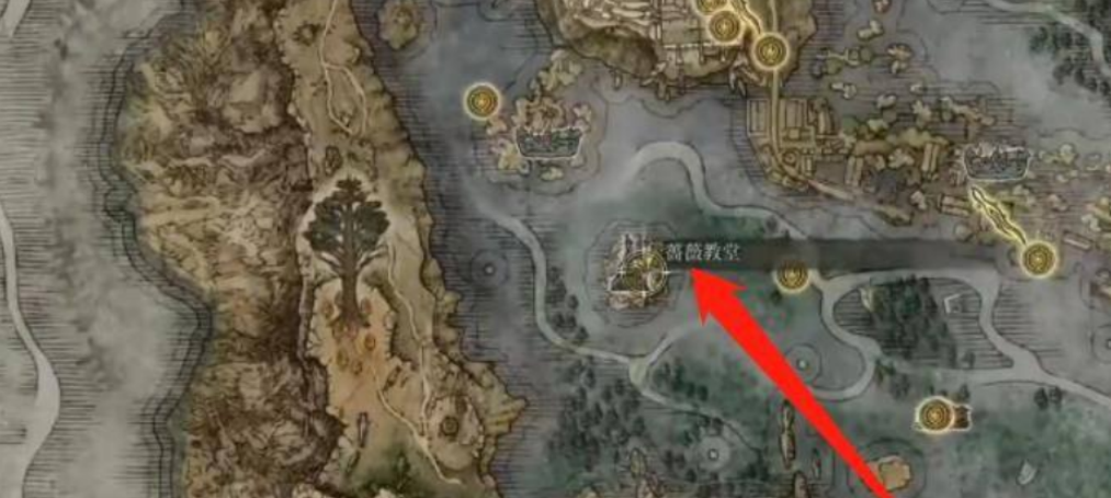 1、打開艾爾登法環的大地圖,移動至薔薇教堂處(途中紅色箭頭指向附近的游標就是教堂位置)。