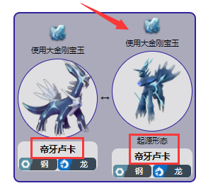 首頁 寶可夢傳說:阿爾宙斯 問答 寶可夢阿爾宙斯帝牙盧卡怎麼變形態? 2022-07-01 在寶可夢阿爾宙斯中,帝牙盧卡是剛屬性與龍屬性的寶可夢,可使用道具【大金剛寶玉】來切換形態,如下所示,帝牙盧卡可在該道具的作用下切換到普通或者起源形態。