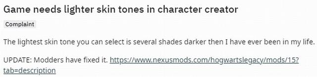 有玩家指出,在亞洲角色方面,也缺乏較白的膚色。還有玩家表示,當前即使是最淺的選項,在實際遊戲中顏色依然很深,不過有Mod可以解決這問題。無論如何,許多粉絲希望《霍格沃茨之遺》未來更新中,能加入更白的膚色。