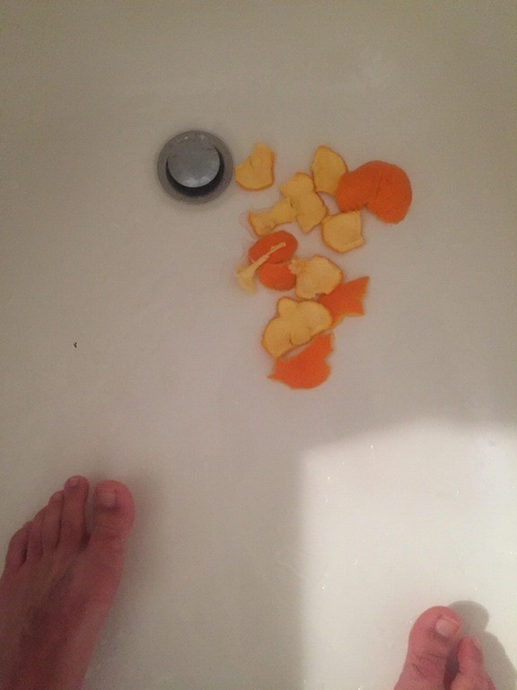 我沐浴在熱水中,剝開了一個橙子,因為買的不是手剝橙,橙子有些難以下手,這一過程中汁水四濺,不過在熱水沖洗下根本不用擔心處理問題。