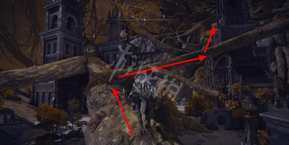 在前方的建築廢墟中繼續通過樹根向上,注意躲避或消滅沿途的怪物。