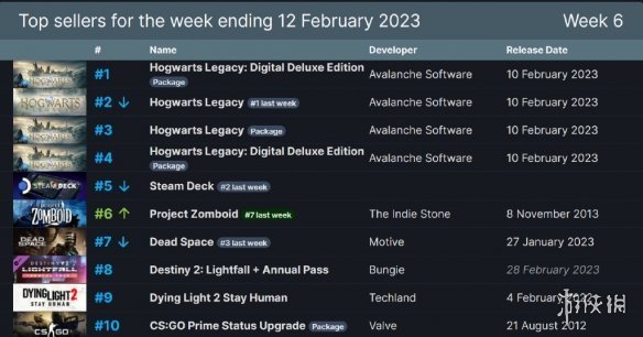 Steam公開了最新一周(2月6日-2月12日)遊戲銷量排行榜,近期發售的《霍格沃茨之遺》熱度暴漲,其各個版本直接包攬前四名。V社的Steam Deck掌機熱度不減依舊很受歡迎,《死亡空間:重製版》還是有很多新玩家購買。