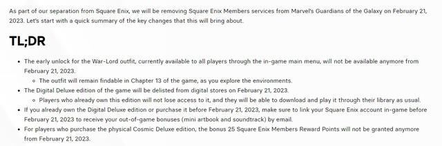 作為與SE分離的一部分,遊戲《漫威銀河護衛隊》宣布將於2023年2月21日從遊戲中移除SE會員服務,在這個日期之前,玩家可以在主菜單鏈接到SE會員服務並提前解鎖裝備「War-Lord」,在移除SE會員服務後,將不再提供解鎖,但玩家仍可以在遊戲第13章中拿到該裝備。