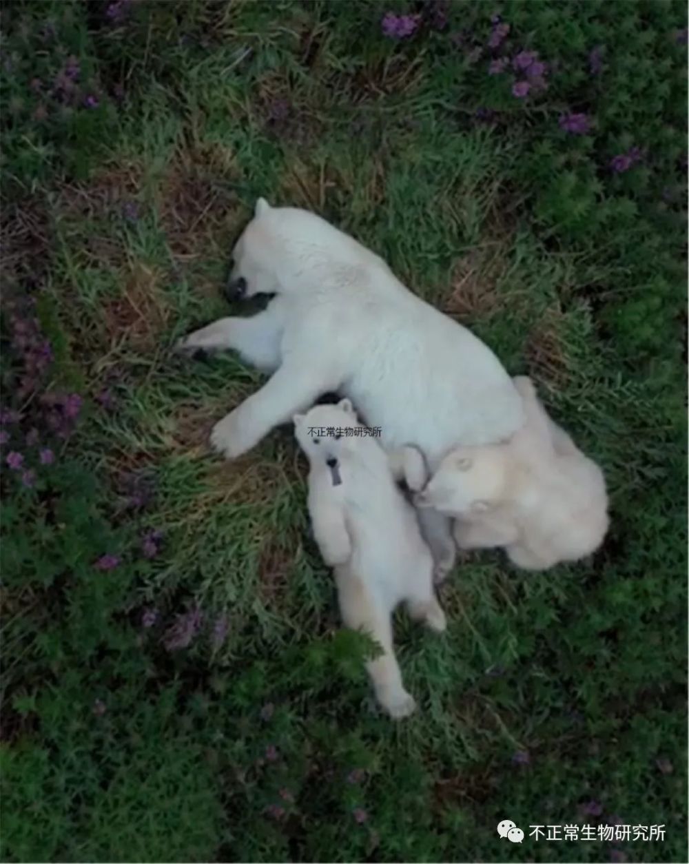 近期,在動物社群中流行著一系列關於北極熊的影片和照片,畫面中我們可以看到帶著兩個孩子的北極熊媽媽正筋疲力盡地側倒在草地上呼呼大睡,雖然無人機就盤旋在北極熊母子的上方,但是累倒的熊媽媽卻一動不動,任由兩個孩子在它的腳邊玩耍,非常可愛!而草地和鮮花與白雪世界相去甚遠,北極熊也可以在這樣的環境中生存,似乎更加愜意!