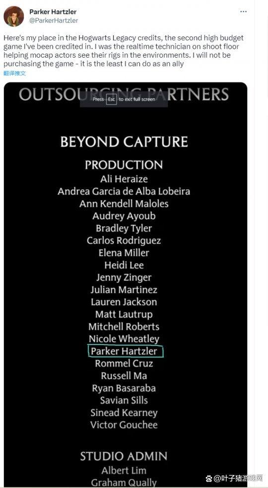 不僅如此,他們甚至還攻略了《霍格沃茨之遺》的遊戲開發者。作為遊戲動作捕捉技術員的Parker Hartzler,在遊戲發售後就在推特上表明了自己支持LGBT的態度。並掛出了在遊戲結束時放出的,演職員名單中的位置。