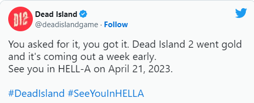經過幾次跳票,《死亡島2》的發布日期終於確認,提前將於4月21日發售,登陸PS5、PS4、Xbox Series X/S、Xbox One和PC平台。開發商今日在推特上宣布該作已經製作完成。