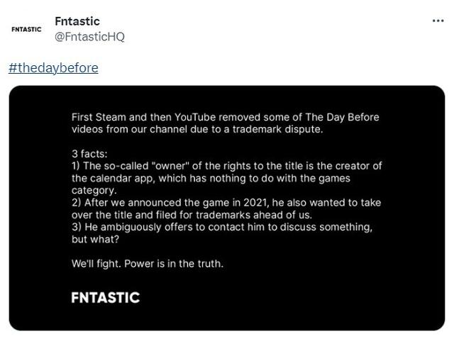 在這份聲明中,Fntastic更清晰地說明了最近發生了什麼,他表示「浩劫前夕(The Day Before)」的商標所有者是一個日曆APP的創建者,與遊戲無關,它在Fntastic之前申請了「浩劫前夕(The Day Before)」的商標。