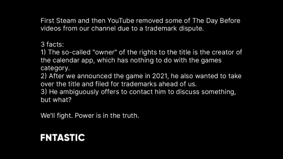 此前,《浩劫前夕》由於商標糾紛宣布跳票並從Steam商店下架。如今這一糾紛似乎已經延續到了Youtube頻道,導致遊戲相關的視頻也被下架。