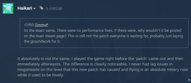 Steam 用戶 Haikari 寫道:「我在『補丁』出來之前玩了這款遊戲,更新只有又玩了一下。兩者差異非常明顯。我之前在霍格莫德從未遇到過這個心不定造成的卡頓問題,飛行曾經很享受,現在只是一種痛苦的體驗。」