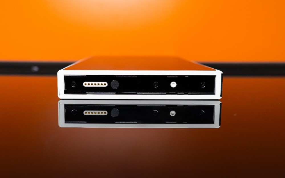 手柄與機器的連接方式是機身兩側的七個觸點和針腳,在接入後會有橙色燈光亮起,用硬朗的燈帶構築出一種科幻的氣氛,十分符合OneXPlayer品牌的定位。