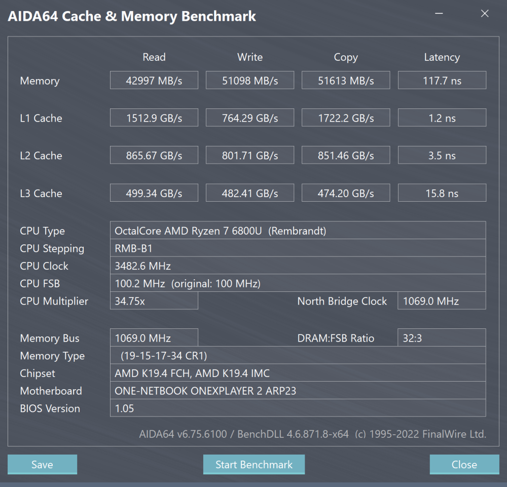 由於Radeon 680M採用共享顯存的架構,內存性能隊最終設備的性能影響是十分顯著的。我們使用AIDA64的內緩存測試,可以看到OneXPlayer 二代的內存系統性能十分強悍,讀速高達42GB,寫速高達51GB這對遊戲性能提升是十分巨大的。我們收到的樣機是16GB的機型,分配了3GB的顯存,但如果用戶對更大容量的內存有需求,也可以選購32GB的機型。
