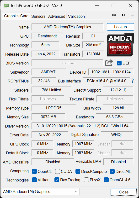 作為第九世代主機的圖形解決方案選擇,RDNA2架構可以說是自從HD7970代表的GCN以來AMD最成功的圖形微架構,無論是實際的性能表現還是能耗比方面,都有與友商硬碰硬而不是差異競爭的硬實力。Radeon 680M擁有12組RDNA2計算單元,最高可以飆到2.2GHz,與桌面端的RX 6400獨立顯卡具有一致的硬體規格與相近的性能表現,應對掌機的遊戲需求來說已經十分夠用。