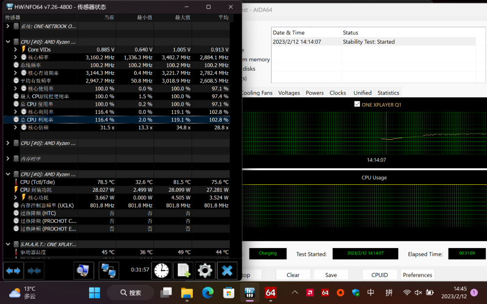 最後, 我們來看一下這套散熱系統的極限。使用AIDA64進行30分鐘左右的烤機,溫度78.5度,功耗28W,CPU頻率3.16GHz。