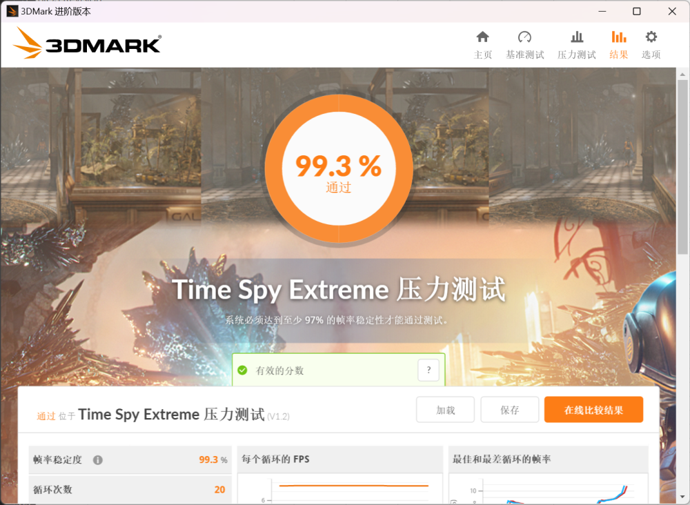 圖形基準性能測試屬於較短的突發測試,並不一定能夠代表機器在長期負載下的性能表現。因此,我們使用Time Spy Extreme的穩定性測試對機器的長期遊戲穩定性進行測試,最終整機的穩定性高達99.3%,這套散熱系統的穩定性可見一斑。