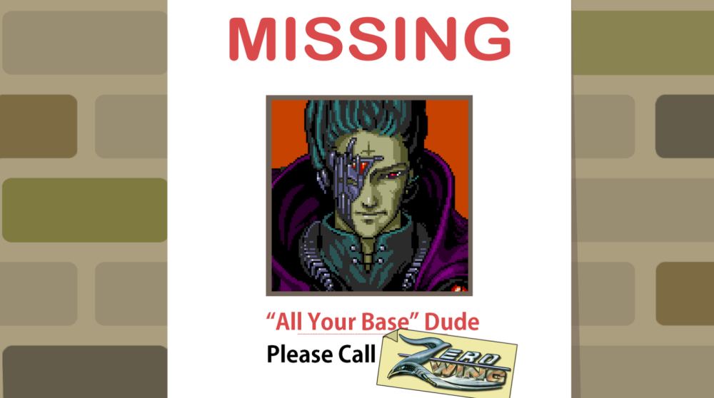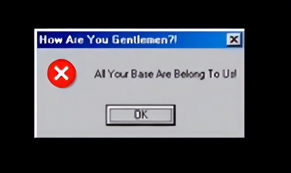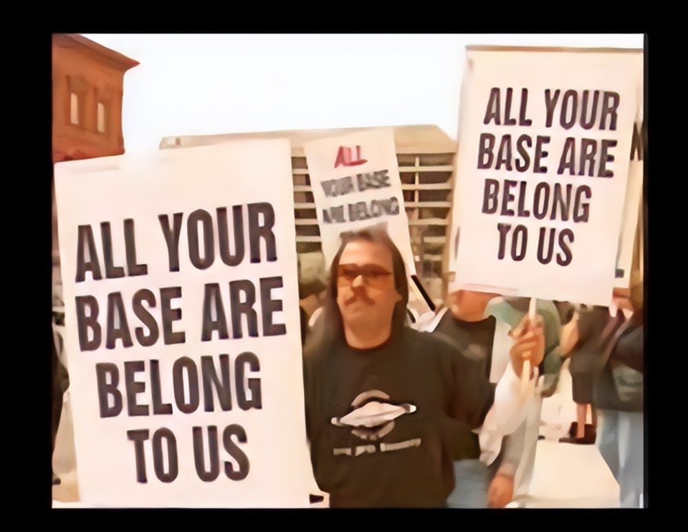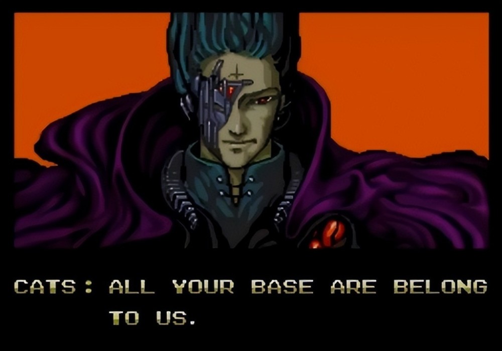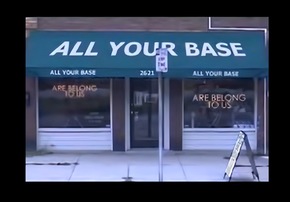 所謂AYBABT梗,是指遊戲過場動畫里的一句著名台詞,「All your base are belong to us」,這是一個典型的問題句子。原句日文是「君達の基地は、全てCATSがいただいた。」,表達的意思是「你們所有的基地都由CATS接收(攻佔)」,而翻譯英文之後不僅文法錯誤,還會被理解成「你們所有的根源是我們」。到1998年,這句話的截圖在西方網路廣泛流傳,到2001年,經過一輪瘋狂改圖、GIF動畫以及Flash熱潮,該句再次爆紅,成一種文化現象。其他遊戲如《魔獸爭霸3》《命令與征服:將軍》都曾引用過這個梗。