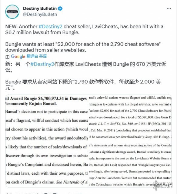 《命運》系列開發商Bungie相關新聞推主Destiny Bulletin透露,Bungie近期起訴了外掛售賣網站LaviCheats,要求賠償總共670萬美元(含律師費、訴訟費等),並永久禁止發布《命運2》外掛。
