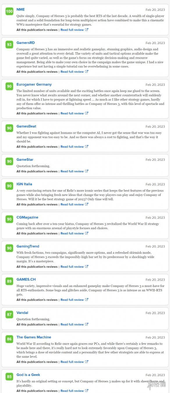 NME:100分,這可能是過去10年最佳RTS遊戲,包含大量單人模式內容和非常紮實的長期多人模式基礎,覺得是電影般的二戰策略神作。