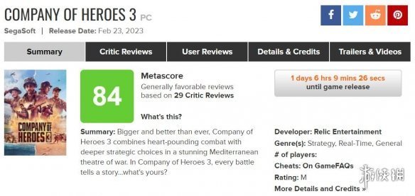 二戰RTS遊戲《英雄連3》即將發售,目前其媒體評分已經解鎖,M站平均分84分,29家媒體有27家給出好評,大部分媒體稱贊本作內容豐富,是一款優秀的即時戰略遊戲。