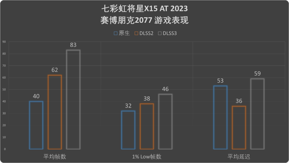 首先是遊戲本評測必不可少的賽博朋克2077,我們採用2K+默認最高預設無光追進行。在原生渲染模式下,遊戲幀數平均在40幀,1% Low也有32幀,這個表現不能說不能玩,但是顯然對於這樣一款FPS遊戲來說是並不算十分舒適的。而在打開DLSS2的質量模式後,平均直接翻到60幀,直接進入可玩的水平。而且,如果玩家不追求最高預設,性能表現還能再進一步提升。開啟DLSS3之後,遊戲性能進一步提升,平均幀率提升至83幀,對於2077這樣的一款遊戲來說已經是絲滑流暢了。