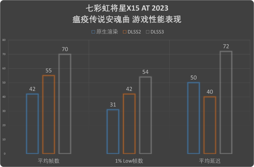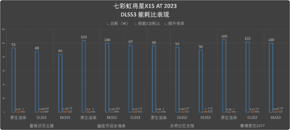 可以看出,4060 Laptop GPU在開啟DLSS之後,不僅性能有所提升,其功耗表現也有顯著進步。尤其是全新的DLSS3,在第五代Max-Q技術的加持下,綜合能耗比表現提升明顯,除了瘟疫傳說安魂曲之外的所有遊戲能耗比表現提升都達到了兩倍以上,即使是安魂曲也達到了1.8倍的能耗比表現提升。隨著遊戲開發者熟悉DLSS3工具包以及NVIDIA不斷提供進一步的驅動打磨,未來DLSS3的性能表現想必還能進一步優化。