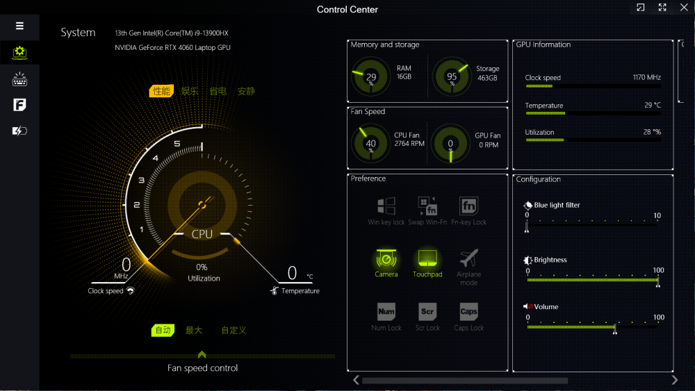 七彩虹的遊戲本是與台灣藍天這家全球頂級的ODM企業合作研發的,因此在機載軟體上也沿用了藍天的第六代 Control Center(以下簡稱CC6.0)。 應該說,CC6.0在功能上還有很大的進步空間,例如添加一個允許用戶自行定義功耗分配的功能就十分實用,但總的來說它也完全能夠應對用戶在日常使用中會遇到的場景了。