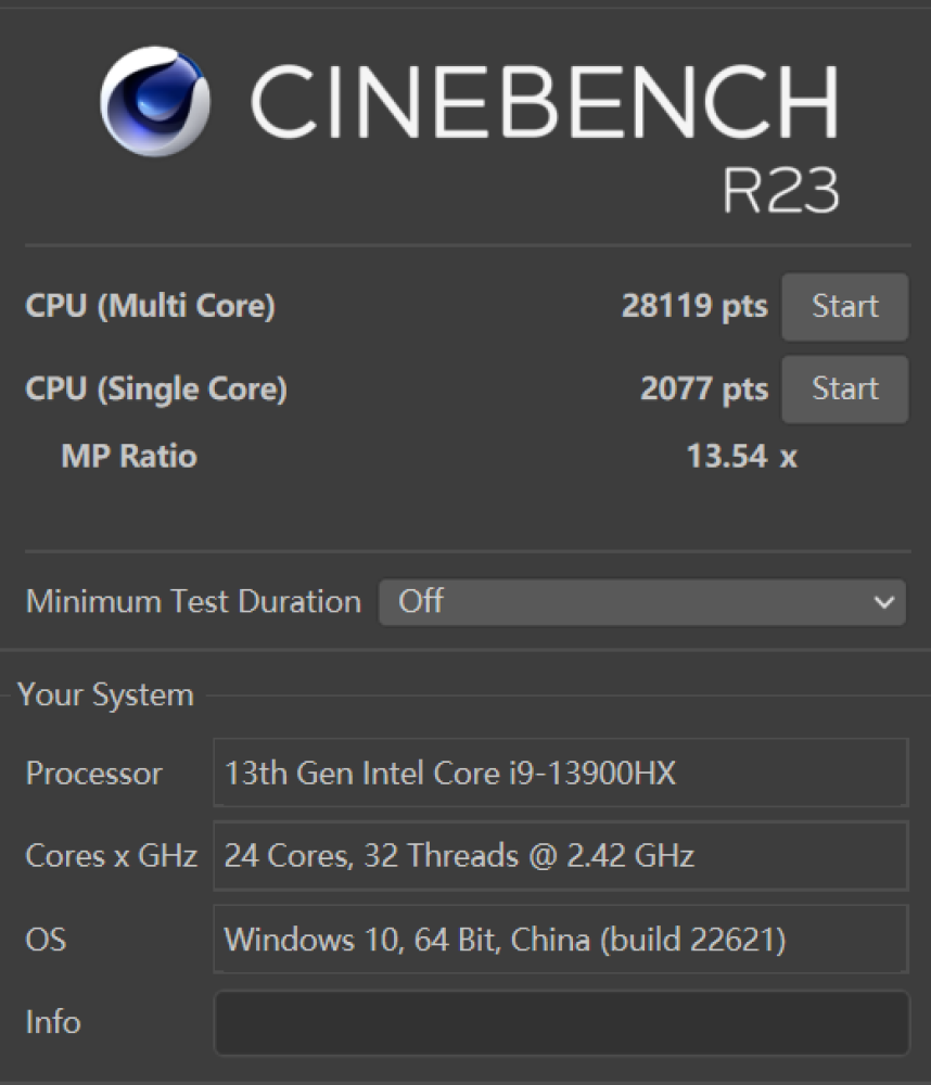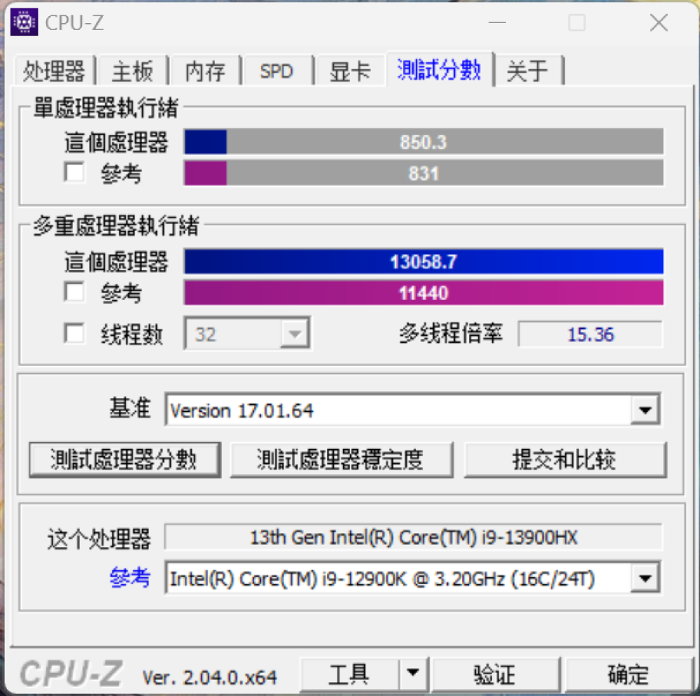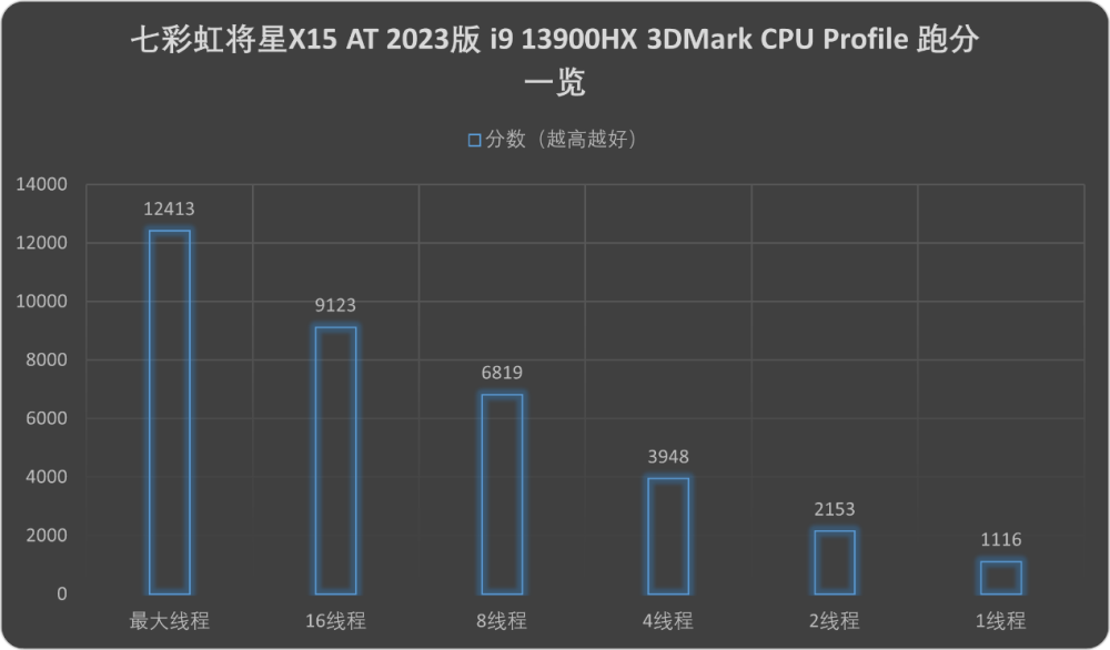 在3DMark的CPU Profile中,這顆處理器跑出了全線程12413分的成績;而在CPU-Z的跑分中,這顆CPU跑出了單核850多核13058的成績,足以蔑視上代桌面旗艦i9-12900K、至於Cinebench R23,單核2077多核28119分的成績也足以在CPU性能榜上傲視群雄。