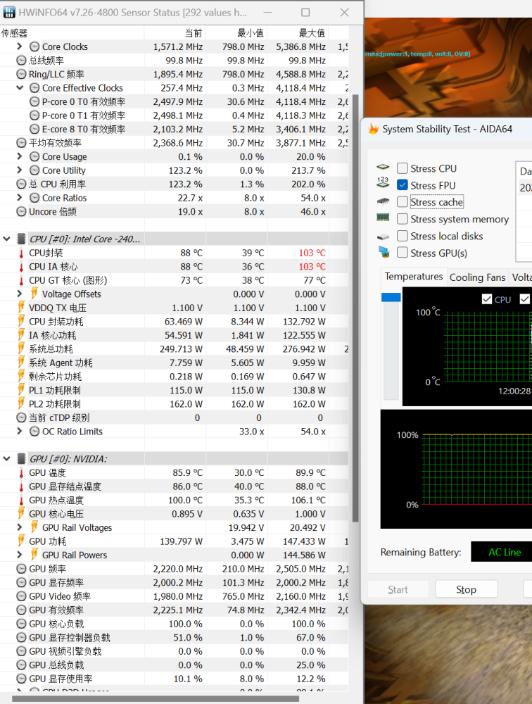 在FurMark與AIDA64的FPU烤機中,這套散熱系統讓將星X15 AT達到了雙烤65+140共計205W的表現,此時CPU大核2.5GHz,小核2.1GHz,顯卡核心2235MHz,溫度分別為88度和86度。以它的尺寸來說,這種成績已經算是不錯了。不過需要注意的是,儘管此時顯卡報告頻率僅有2235MHz,但在FurMark以外的場景中,顯卡都能夠長期跑到標準的Boost頻率。