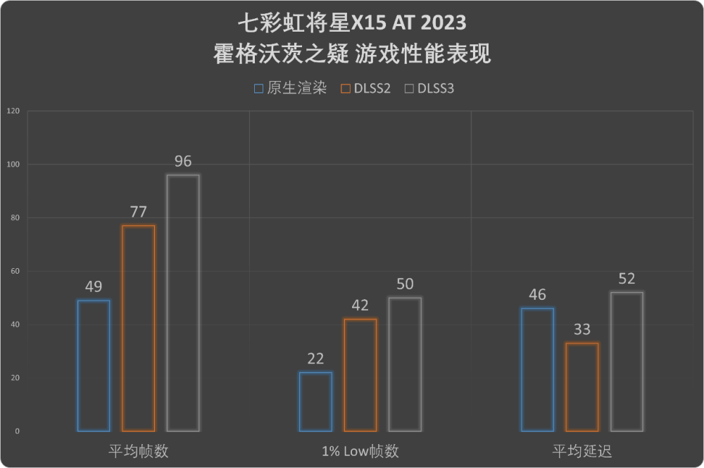 第二個我們要聊的是最近剛剛上線的大作霍格沃茨之疑。作為一個ARPG遊戲,霍格沃茨之疑對平均幀數的要求其實不算特別高,尤其考慮到遊戲自帶可以靈活切換的鎖敵功能,使得遊戲對玩家「拉槍「能力的要求進一步下降。因此,在霍格沃茨的測試中,我們採用2K最高預設無光追進行測試來展開。在原生渲染模式下,50幀的平均幀數確實可以接受,但22幀的1% low意味著在激烈的魔法「對槍」中玩家有一定的概率感受到微卡頓,但只要開啟DLSS2,無論是平均幀數還是1%low都有明顯的進步,且延遲也有降低,使得遊戲體驗可以相對提升很多。開啟DLSS幀生成之後,遊戲性能還能進一步提升,平均幀將近100,性能表現直接翻番,強悍如斯。