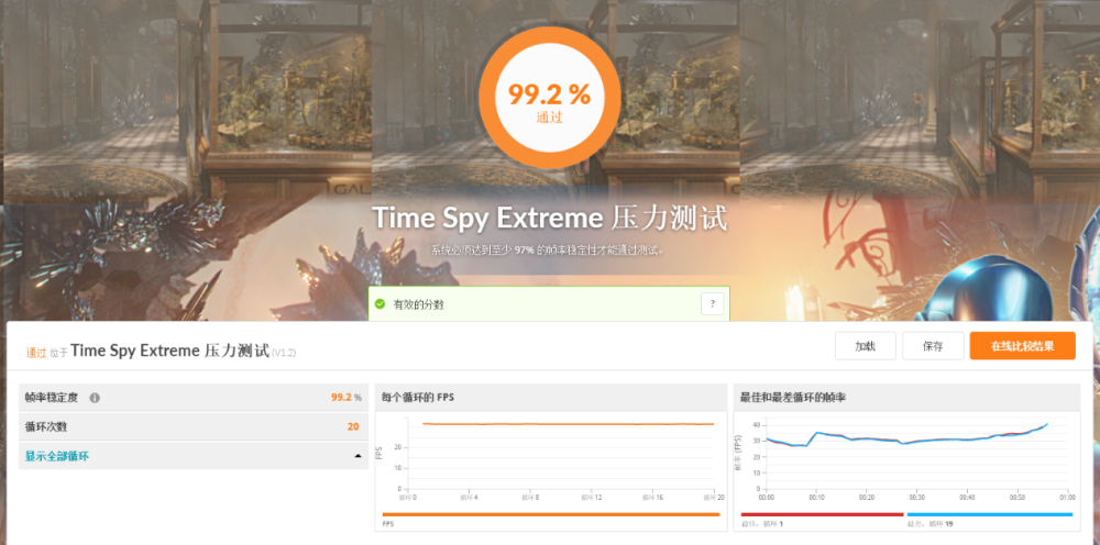 這一點也可以從3Dmark的Time Spy Extreme穩定性測試中看出,將星X15 AT在20輪TSE跑分中的穩定性達到了99.2%,可以說是穩如poi了。
