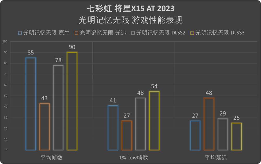 光明記憶無限應該是我們這次測試的非電競遊戲里對性能要求最低的。作為一個純粹的FPS遊戲,它的優化做的非常不錯。即使採用原生渲染,遊戲也能跑出85幀的水平,而即使開啟光追它也能享受主機級的幀數表現。因此,我們之後DLSS2和DLSS3的測試全部開啟光線追蹤,性能表現也不算落後,即使不開啟DLSS幀生成也能做到平均78、1% Low 48,同時操作延遲與原生渲染不相上下;開啟DLSS幀生成之後性能進一步提升到1% Low都接近60,操作手感更為絲滑。