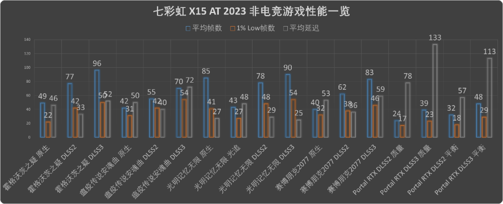 遊戲本遊戲本,能打遊戲的才是好遊戲本。我們選擇了多款遊戲來全方面測試這款大眾遊戲本的遊戲性能,它們分別是代表傳統電競遊戲的CSGO和DOTA2,代表現代電競遊戲的Apex Legend,以及代表大型遊戲的霍格沃茨之遺、賽博朋克2077、瘟疫傳說、Portal RTX和光明記憶無限。接下來我們來看看這些遊戲跑的怎麼樣。
