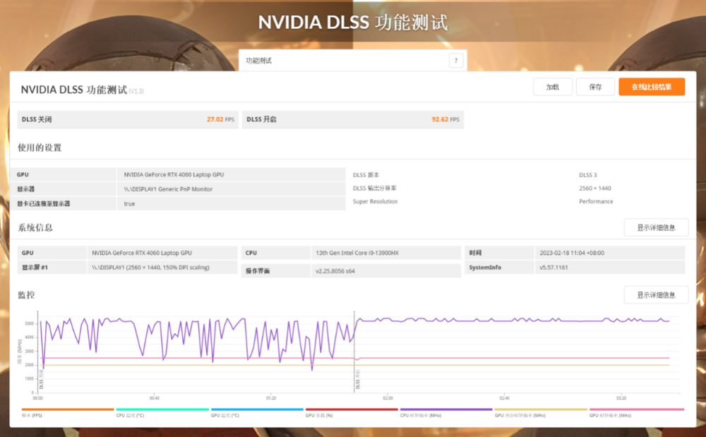 除了架構層面的改進之外,40系遊戲本顯卡新增的DLSS3功能也十分強悍,對於RTX 4060 Laptop GPU這樣入門級2K移動顯卡來說更是如此。在3Dmark的NVIDIA DLSS功能測試中,我們在2K質量擋測試出了將近翻三倍的表現,這種性能提升感知顯然是很強的。不過,DLSS3在實際遊戲中帶來的性能提升需要具體遊戲具體分析,因此這個數據只能用作參考。