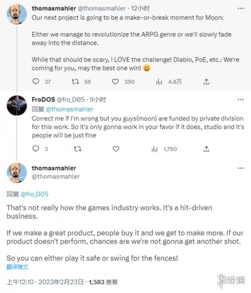 《奧日》系列開發商Moon Studios 的CEO 兼 創意總監 托馬斯·馬勒 (Thomas Mahler)在推特放出豪言,他稱團隊的下一款作品要麼功成名就,徹底改變ARPG類型,要麼工作室將會被大家慢慢遺忘。他還致敬了《暗黑破壞神》和《流放之路》,透露這款作品將採用俯視視角。