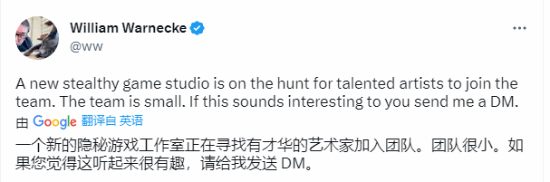 近日,《守望先鋒》前首席軟體工程師、電子游戲製作人William Warnecke在推特表示,一個新的小游戲工作室正在尋找有才華的美術設計師加入團隊。