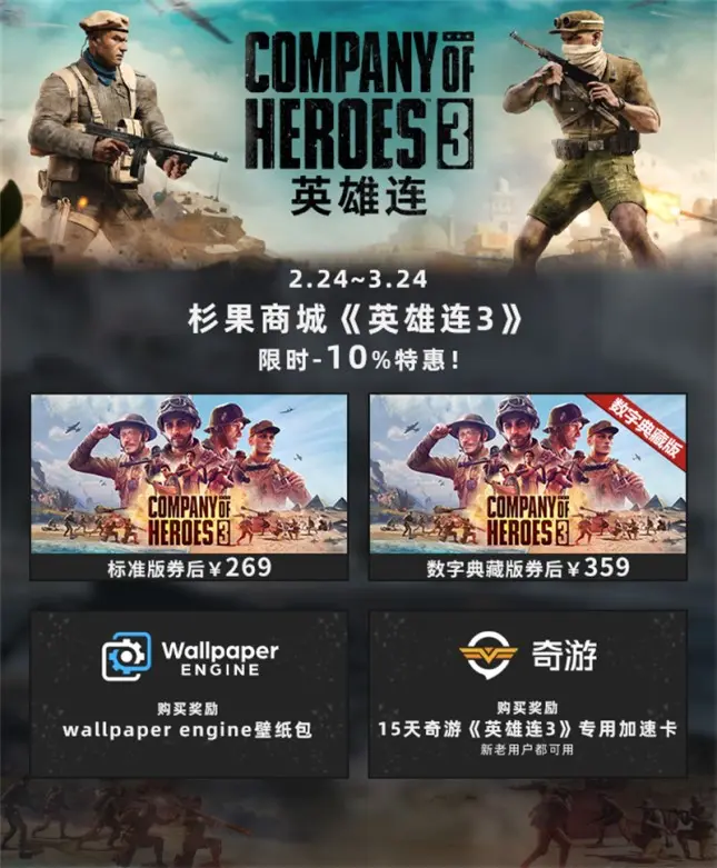 現在購買還可獲得 Wallpaper Engine 可用壁紙包,此外方便廣大玩家聯機體驗 PVP 模式,購買還可免費獲得 15 天奇游加速器《英雄連3》專用加速卡(新老用戶都可用)。