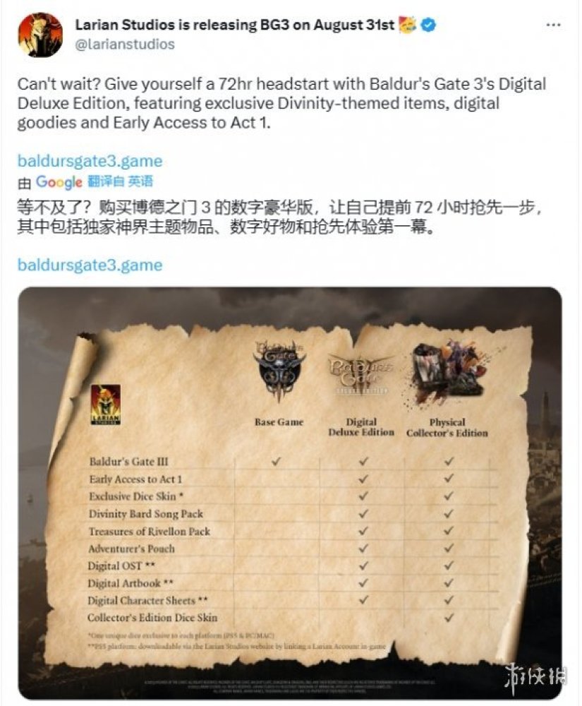《博德之門3》已確認在8月31號推出正式版,開發商 拉瑞安工作室 宣布,購買《博得之門3》數字豪華版的玩家可以提前72小時搶先體驗遊戲(第一章),另外還有豪華版專屬獎勵。