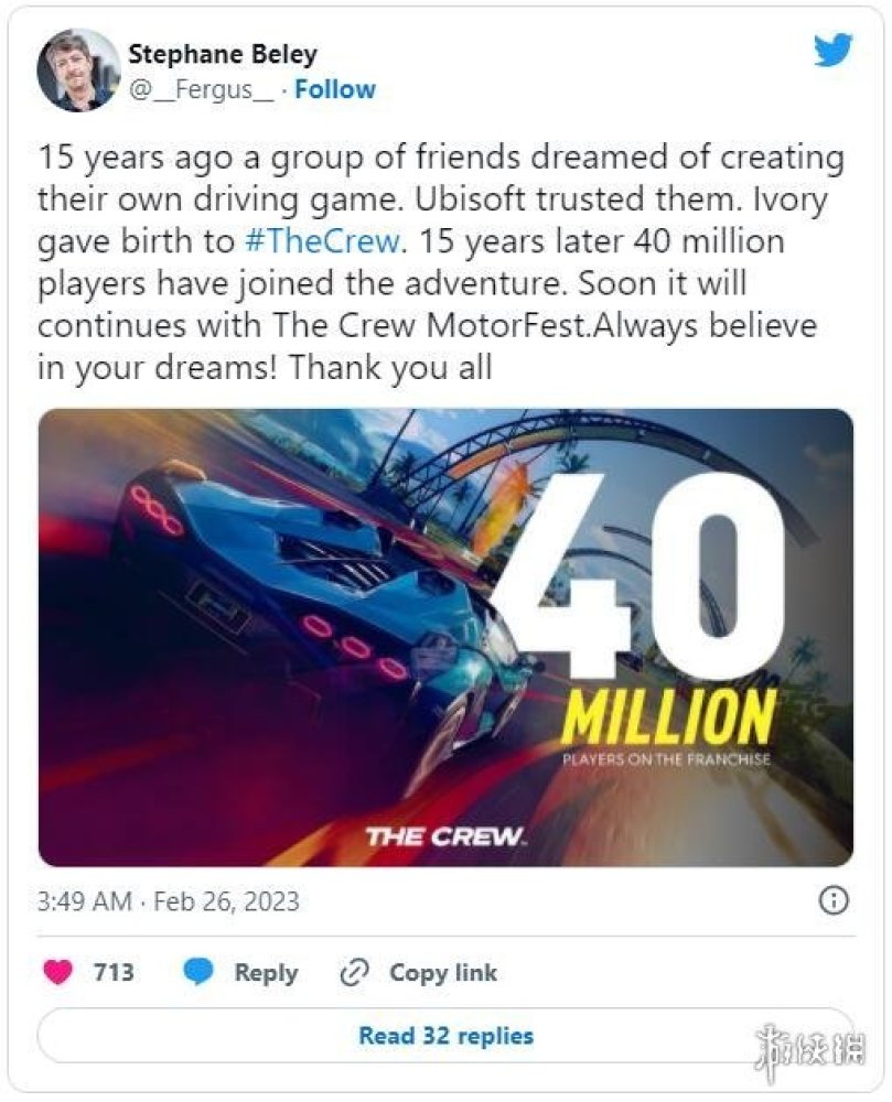 雖然育碧的賽車遊戲《飆酷車神》系列並沒有達到微軟《極限競速》系列和索尼《GT賽車》那樣的高度,但不可否認的是,它依然是一款大獲成功的遊戲——遊戲創意總監Stephane Baley昨天的推文便證實了這一點。
