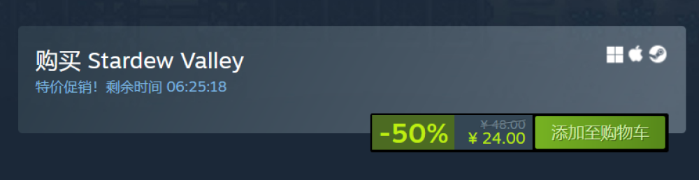 為慶祝游戲誕生7周年,Steam上的《星露穀物語》正以歷史最低價售賣中,打五折之後的國區價格為24元。活動於2月27日開放,只持續12個小時,截稿前僅剩下6個多小時。