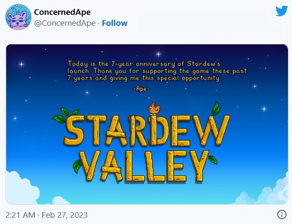 作者Barone在2月27日發推文:「今天是星露穀物語發行七周年,感謝大家七年來對這款游戲的支持,以及給與我這個難得的機會。」粉絲紛紛轉載,表達感激之情。