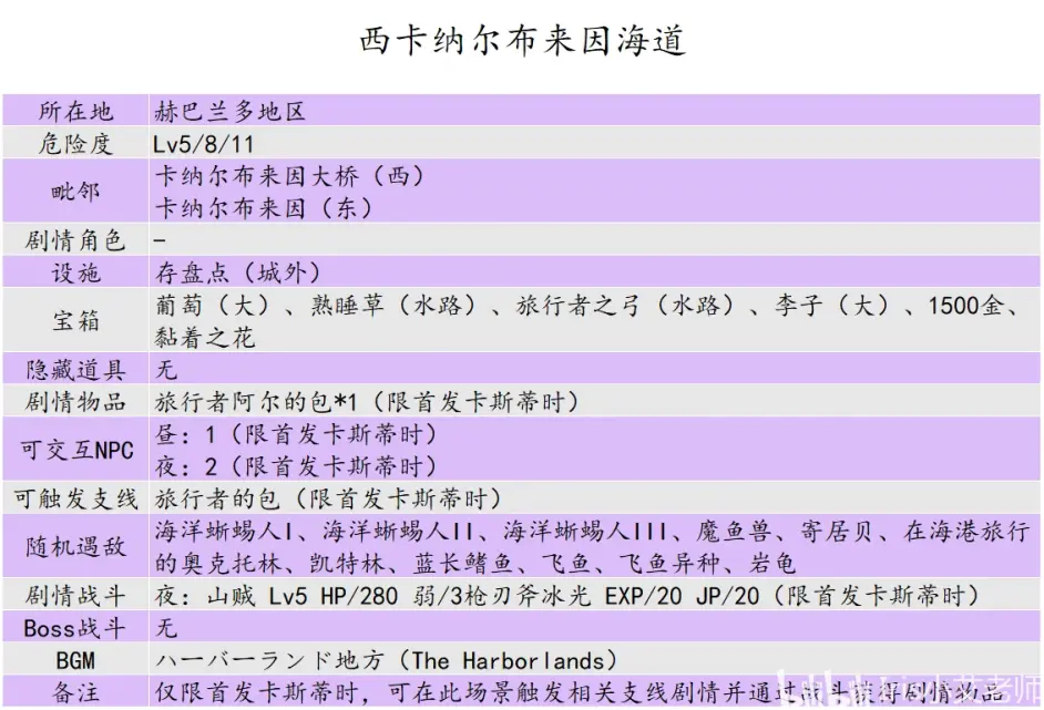 這場景好大西卡納爾布來因海道作為鄰接新手村的場景。當首發角色是卡斯蒂時,會承載一個與首發角色綁定的特殊支線任務。