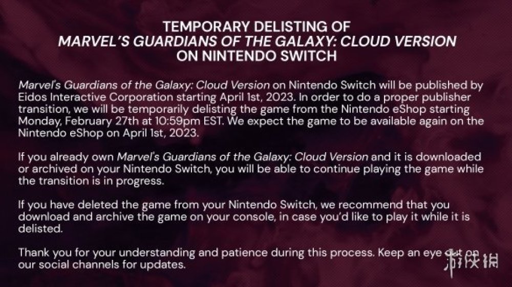 今日官方宣布雲遊戲版《漫威銀河護衛隊》將於2月28日中午12點從任天堂eShop下架,4月1日後發行商由將由Square Enix變更為Eidos Interactive,需要完成過渡准備。下架期間無法購買遊戲,已擁有遊戲的玩家下載至主機就不會受影響。