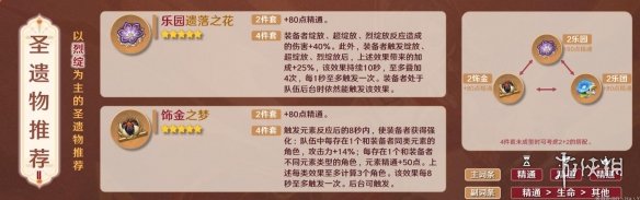 對於目前來說,所有可穩定以及持續觸發超綻、烈綻這兩種反應的角色,在聖遺物的選擇上都是一致的。要麼4樂園,要麼4飾金,沒成型時2樂園+2飾金都可。
