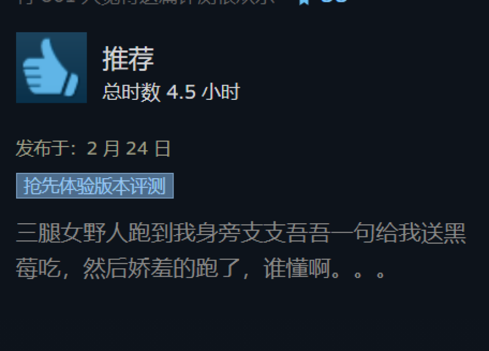 而這段詭異的感情,以至於讓評論區的畫風都魔幻了起來,比如說有玩家開始了直男式懵懂的發言,「三腿女野人跑到我身旁支支吾吾一句給我送黑莓吃,然後嬌羞的跑了,誰懂啊!」