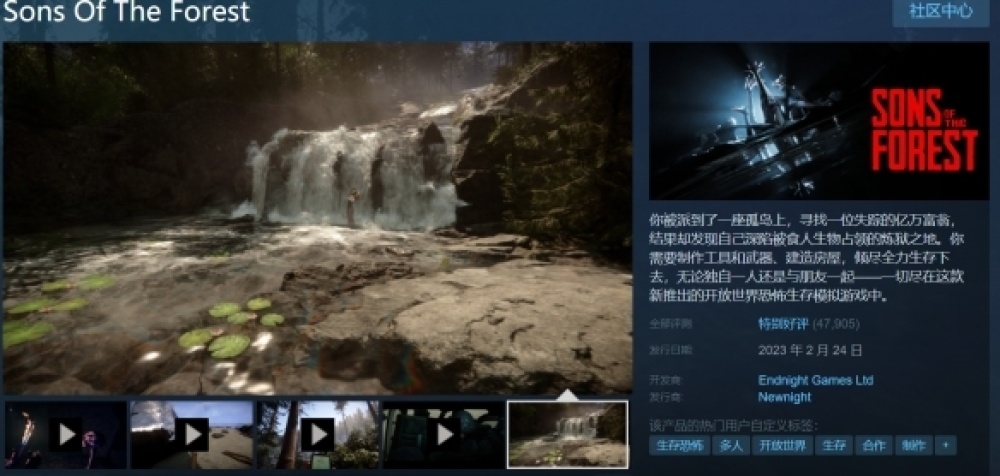 《森林之子》是2015年加拿大Endnight Games工作室《森林》的續作,當年《森林》憑借不俗的質量,創下了500萬銷量,被一些媒體稱之為最成功的獨立游戲。靠著前作延續下來的人氣,《森林之子》在發售後游戲同時在線人數首日27萬,Steam「特別好評」。