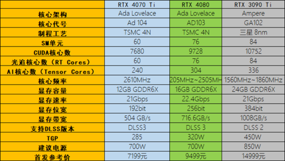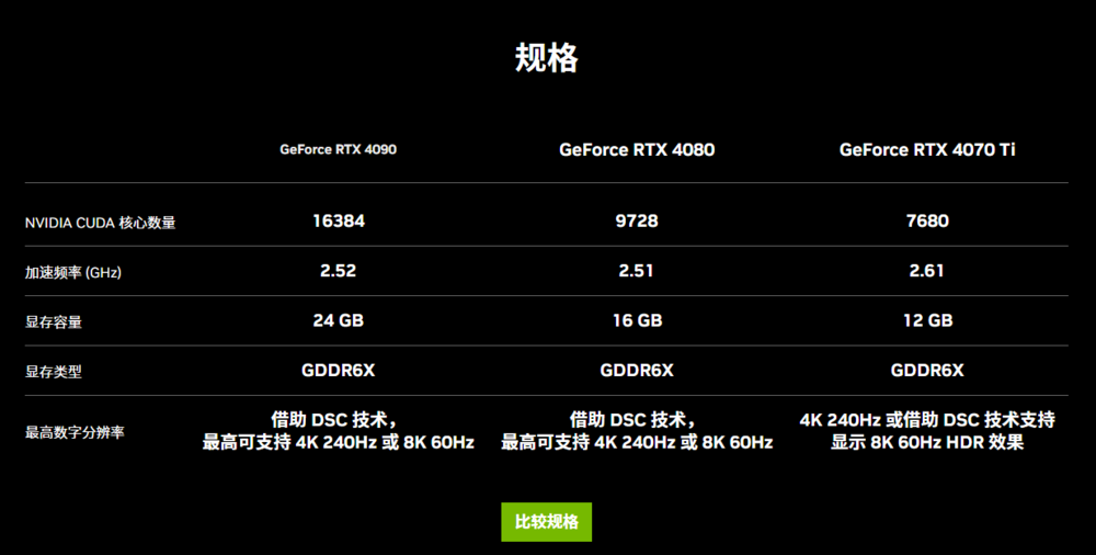 核心參數上RTX 4070 Ti和之前老黃砍掉的RTX 4080 12G基本一致,核心為AD104,7680的 CUDA核心,12GB GDDR6X顯存,顯存位寬192Bit,顯存帶寬速度504.2GB/S、48MB L2,總體來看這個規格不到AD102的一半,按以往的傳統104的核心至少有102核心的三分之二。