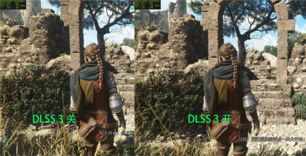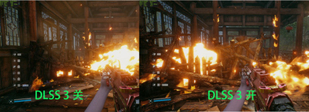 此外RTX 40系顯卡本次最大的提升還是DLSS 3技術、包含幀生成、DLSS超解析度、NVIDIA Reflex、幀生成是本次RTX 40系獨有技術。DLSS 3是本次RTX40系顯卡最大的變化之一,DLSS 3包括光學幀生成、超級解析度和NVIDIA Reflex三個部分。在原有的DLSS超解析度的基礎上,添加了光學多幀生成技術,以生成全新的幀,而不像原來只能生成像素。基於第四代Tensor Core和強大的光流加速器,DLSS 3能夠預測場景中幀和幀之間的運動變化,通過AI生成幀畫面插入到常規渲染幀之間,在保持圖像質量的同時提高幀率,並集成了NVIDIA Reflex低延遲技術以實現最佳響應,從3DMARK的DLSS 3測試來看,開和不開差距相當明顯,這裡使用一些支持DLSS的遊戲進行測試。