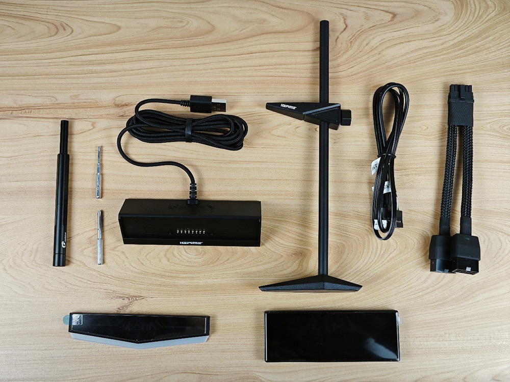 打開整個包裝除了顯卡本體之外,裡麵包含說明書、保修卡、拭鏡布、螺絲刀、磁吸燈光組件、磁吸LCD屏幕各一個,顯示屏底座一個、防靜電手套一副、以及顯卡支架一個,然後就是目前新的16pin供電介面轉接線一根,燈光同步線一根。畢竟是旗艦卡附送的配件以及工是十分齊全的。