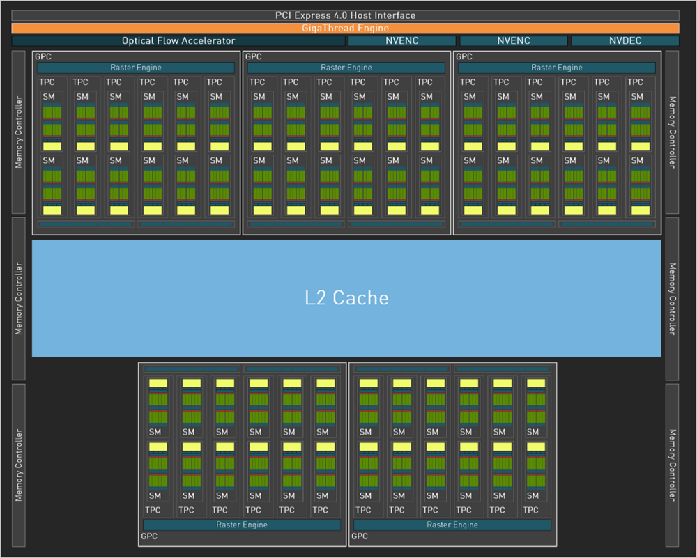 RTX40系顯卡這一代依舊擁有6組TPC,一個獨立光柵引擎和兩個ROP分組組成,每組TPC裡麵包含2組SM單元,架構和上代的安培保持一致,每個SM單元內有4個計算模塊,包含RT光追核心、以及120KB的一級緩存, 而每個計算模塊內包含一個Warp調度器、一個分配單元、16個FP32單精度浮點單元CUDA核心和16個FP32/INT32單精度浮點和整數混合CUDA核心,一個Tensor Core核心。 RT Core光追核心從之前的第二代升級到第三代,Tensor Core張量核心也從第三代升級到第四代,光追算力是上代的3倍。