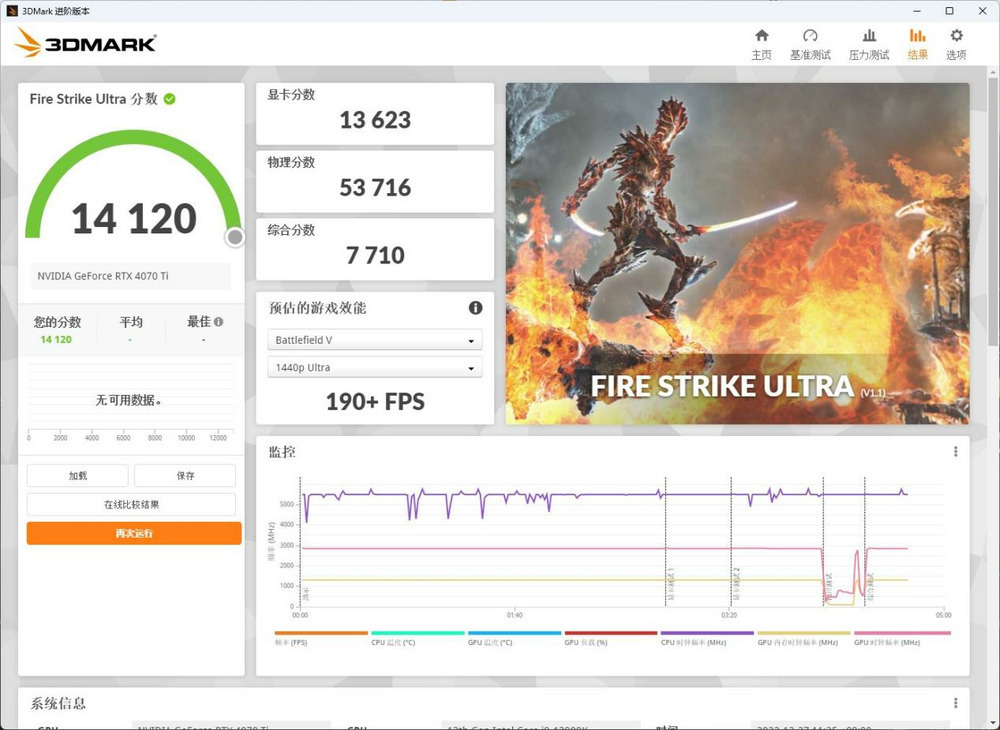 FireStrikeUltra在2K@144解析度下,得分為14120,顯卡得分13623