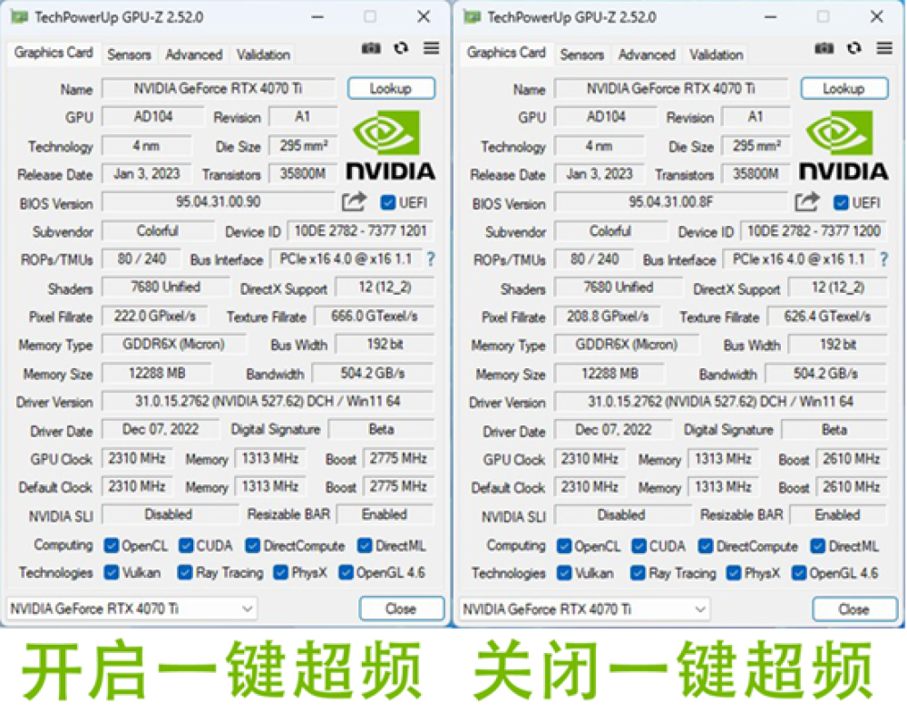 RTX 4070 Ti擁有更加先進的工藝,加上光追效率的改進,相比於老一代卡皇3090 Ti成績不相上下,此外DLSS 3獨有的幀生成是其他RTX30系顯卡所沒有的。七彩虹iGame RTX 4070 Ti Vulcan OC又是一款定位旗艦的RTX 4070 Ti,且配件豐富,不管是做工還是用料都十分符合對於這個價位顯卡的發燒友在個性化體驗上的追求。